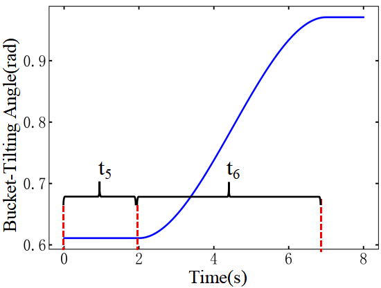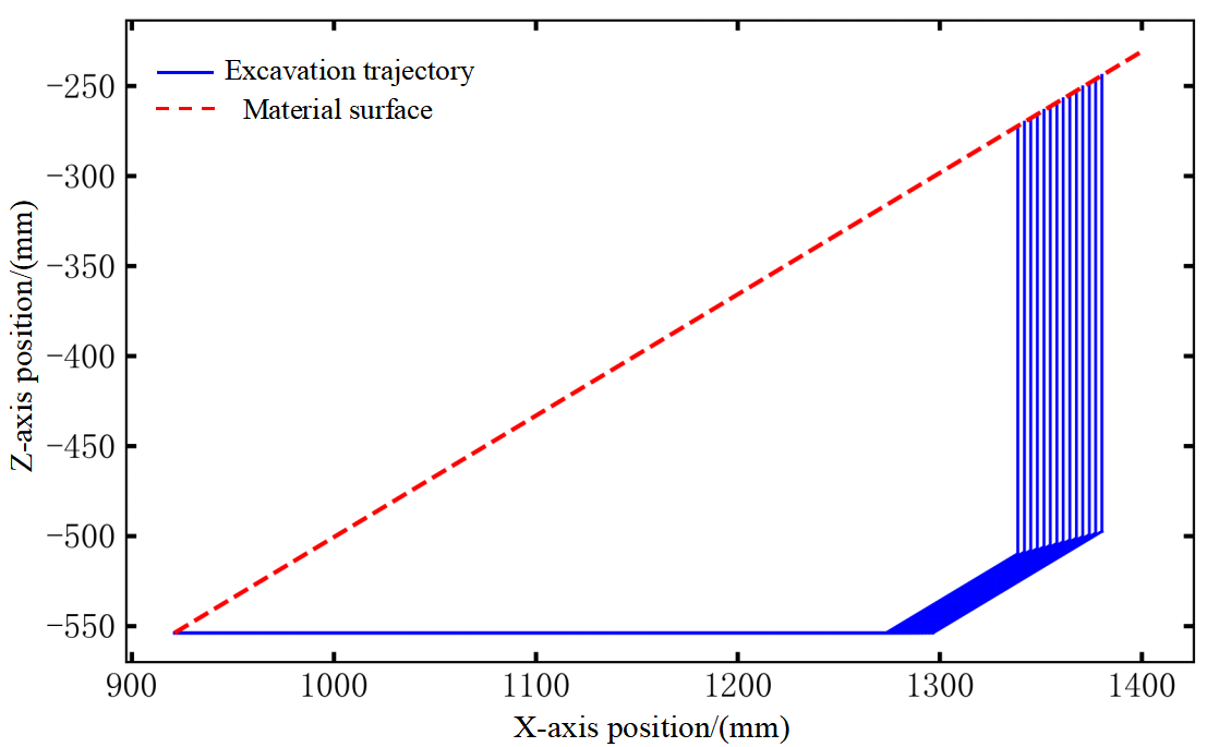 Through inverse kinematics inference, the optimal trajectory in joint space is transformed into the optimal trajectory in driving space, as shown in Fig. 22. This trajectory can be directly used as input commands for intelligent control, enabling efficient and autonomous excavation operation of the loader via trajectory tracking.