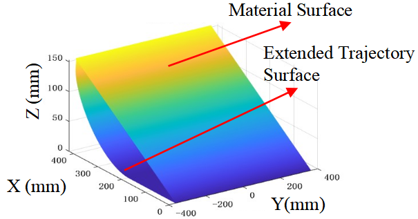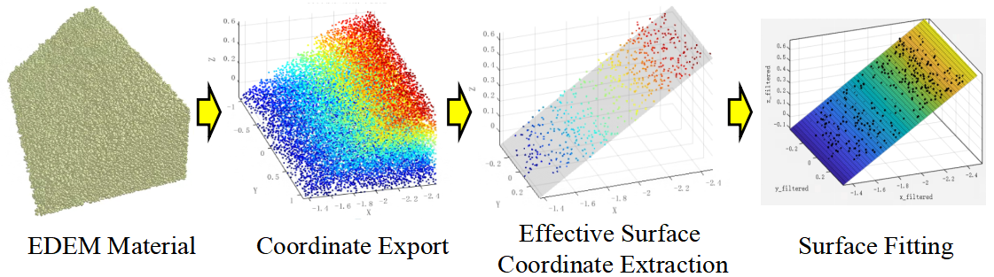 After the co-simulation, the time-series 3D coordinate data of material particles exported from EDEM are extracted and preprocessed to obtain the particle coordinate sets for all time steps. A polynomial fitting surface equation is established as shown in (26). By substituting the bucket tip trajectory’s X- and Y-axis data, derived from forward kinematics, into the equation, the corresponding material surface height at each trajectory point can be calculated.