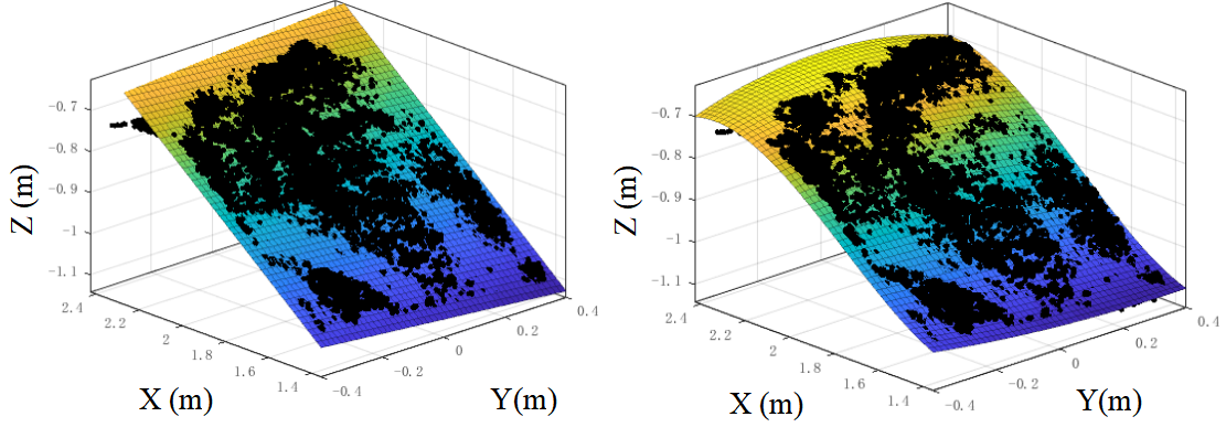 (3) Material Pile Surface Fitting: The point cloud within the effective region undergoes a twostep fitting process: First, a firstorder fitting is applied to obtain the angle of repose of the material pile, as shown in Fig. 19(a). This is used for initial linear trajectory planning to determine key points of the buckettip trajectory. Second, a polynomial fitting is performed to derive a highprecision surface shape of the material pile, as illustrated in Fig. 19(b), ensuring the accuracy of excavationvolume calculations.