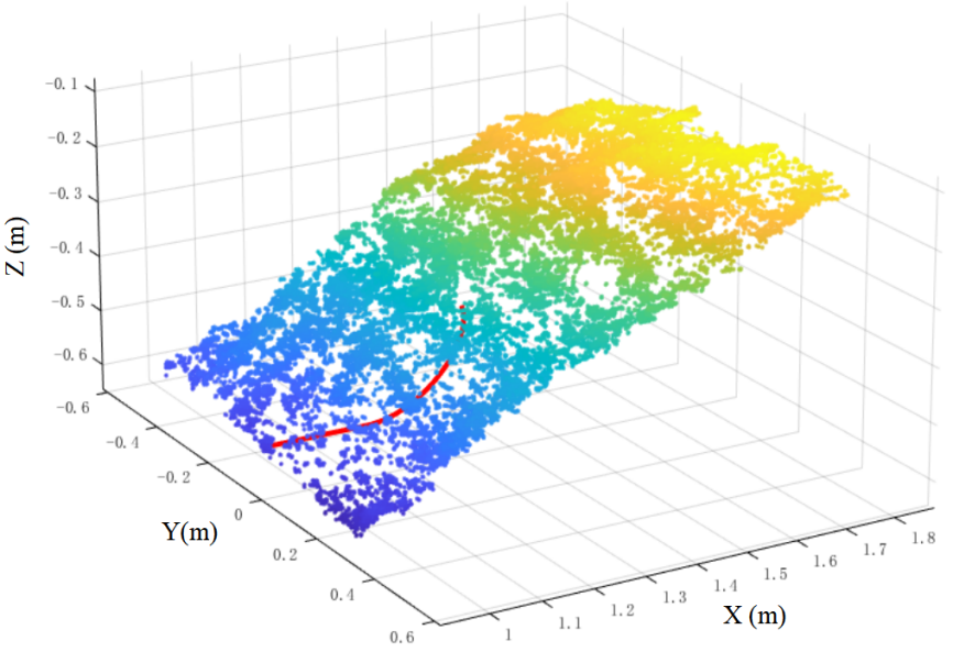 (2) Region of Effective Cropping: Based on the bucket width, the effective region of the material pile point cloud is cropped, as shown in Fig. 18, to reduce subsequent computational load and improve processing efficiency.