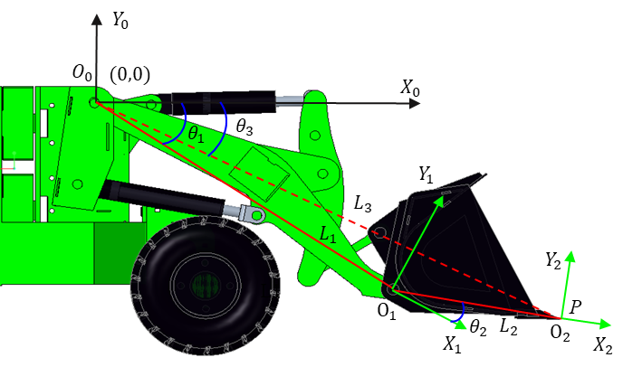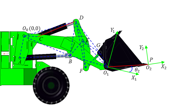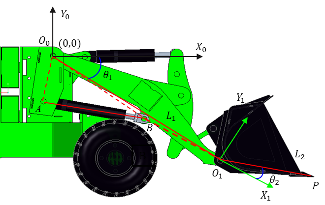 In summary, the relationships between the lengths of the lift cylinder and the bucket tilt cylinder as functions of the joint rotation angles and can be established, while all other working mechanism parameters are known design values.
