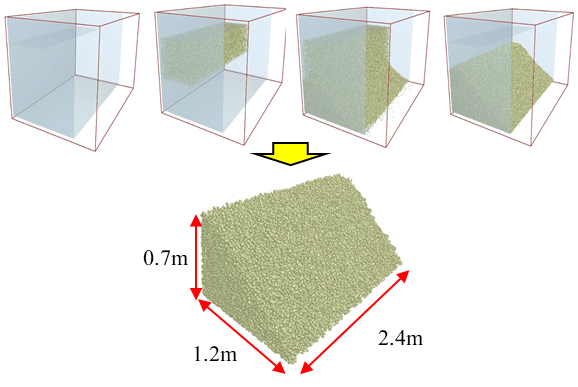 This study employs the Discrete Element Method within EDEM to construct a crushed stone material model, aiming to accurately simulate the interaction behavior between the material and the bucket. The modeling process is as follows: Firstly, the particle shape and particle size distribution are determined. Three particle shapes are mixed in equal mass proportions, and the particle size distribution, based on standard sieve analysis, is set as 10 mm (40%), 15 mm (30%), 20 mm (20%), and 25 mm (10%). Secondly, referring to relevant co-simulation literature [19], the intrinsic parameters and contact parameters for the material and the bucket are configured. Finally, particles are generated using a particle factory, with the generation area bounded to match the bucket width to reduce computational costs. To replicate the diversity of material piles in real working conditions, multiple material piles with different angles of repose are generated. This paper takes a typical working condition as an example: the generated material pile has a base dimension of 2.4 m × 1.2 m, a top height of 0.7 m, and an angle of repose of 34°, as shown in Fig. 6.